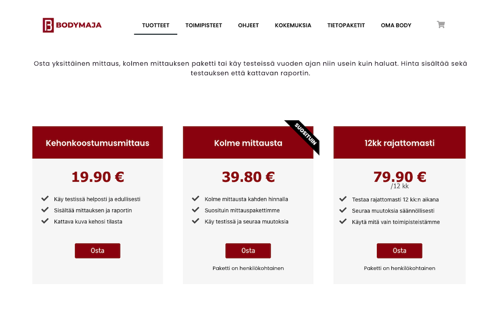 Ihminen ostaa itselleen verkkokaupasta tyypillisesti sarjan mittauksia. Ensimmäinen mittaus antaa lähtötilanteen sekä ohjeita ja vinkkejä miten omaa hyvinvointiaan voi parantaa.