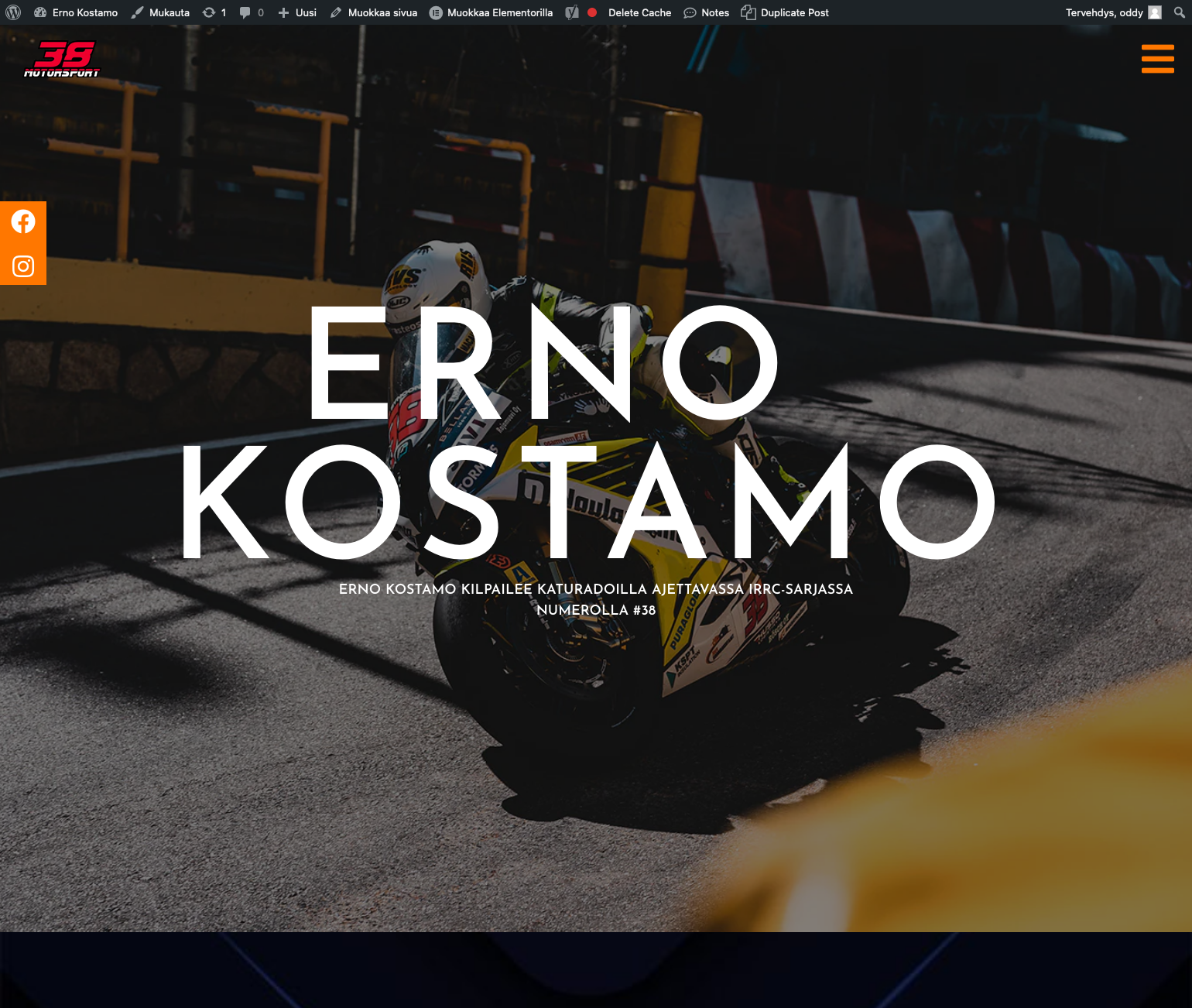 Erno Kostamo on katuradoilla kilpaileva ratamoottoripyöräilijä. Ernon huikea persoona ja äärimmäisen kova ajotaito vakuuttivat Oddy Tech:n lähtemään tukemaan Kostamoa. Halusimme toteuttaa Ernolle näyttävät verkkosivut, jotka kokoavat yhteen verkossa hänestä kirjoitettua ja kuvattua materiaalia.