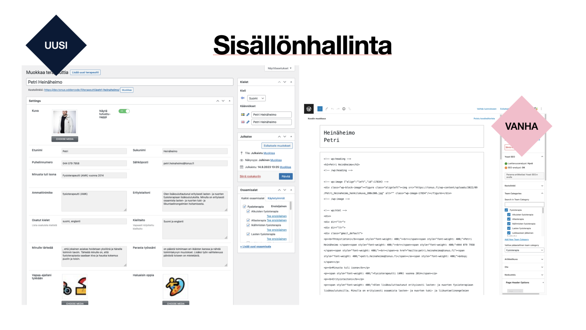 Tonuksen aikaisemmatkin verkkosivut oli toteutettu WordPress julkaisujärjestelmällä. Toteutuksen tekninen alusta oli kuitenkin tullut tiensä päähän. Sivujen päivittäminen, tietojen lisääminen ja muokkaaminen oli erittäin haastavaa ja aikaa vievää.