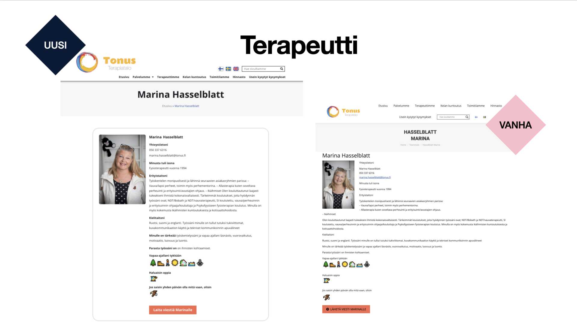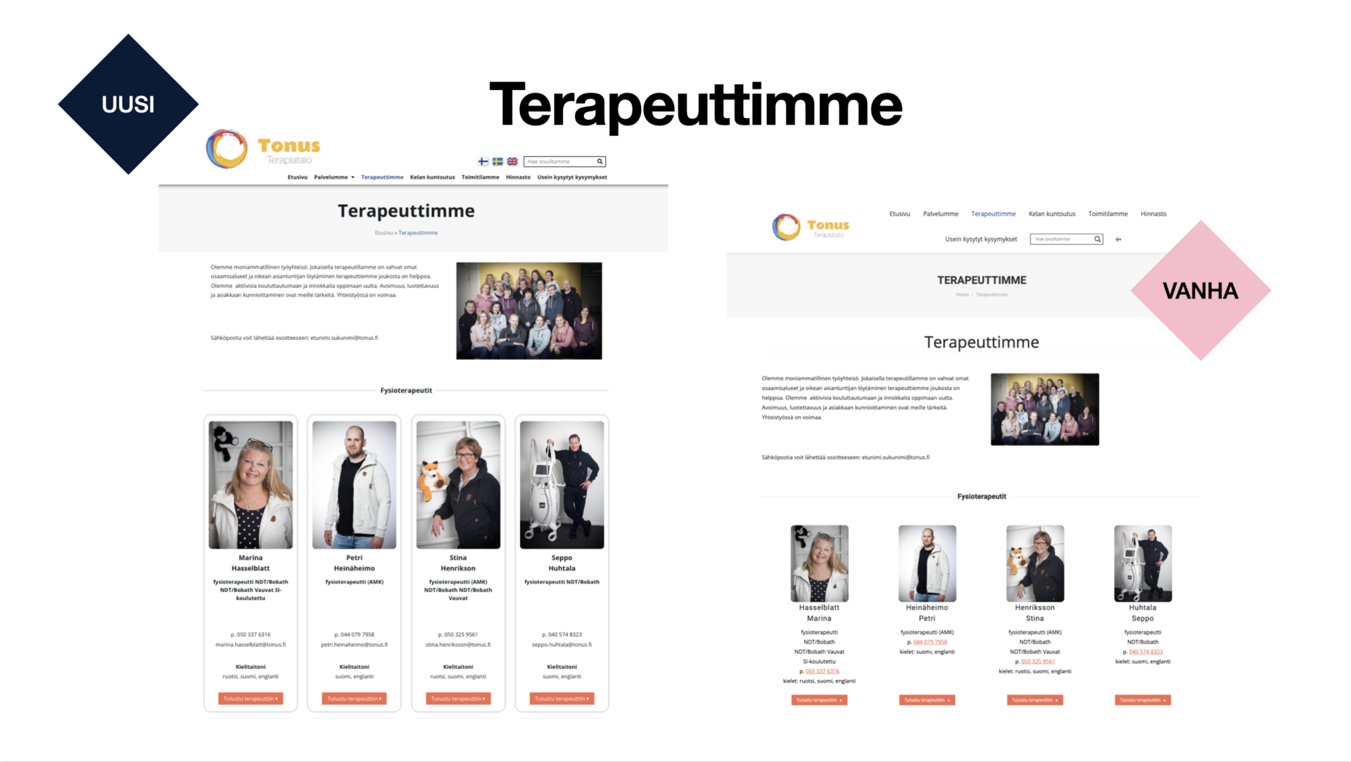 Yhteisessä keskustelussa asiakkaan kanssa tulimme siihen lopputulokseen, että sivujen perusrakenne, tekstit ja kuvat ovat sinällään ajantasaisia, mutta ne kannattaa viedä uuden teknisen alustan päälle. Samalla päästiin tekemään pieniä muutoksia ilmeeseen, toiminnallisuuksiin ja kaikkein tärkeimpiin sisältösivuihin.