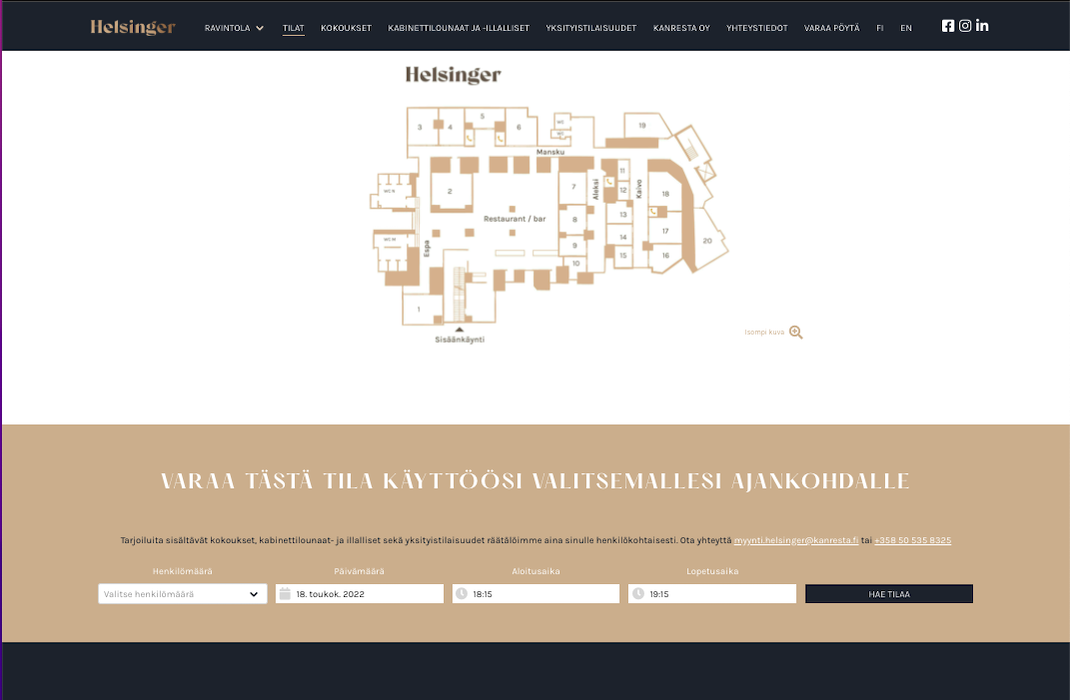 Verkkopalvelusta pystyi varaamaan itselleen ja seurueelleen sopivat neuvottelutilat ja tarjoilut muutamalla klikkauksella.