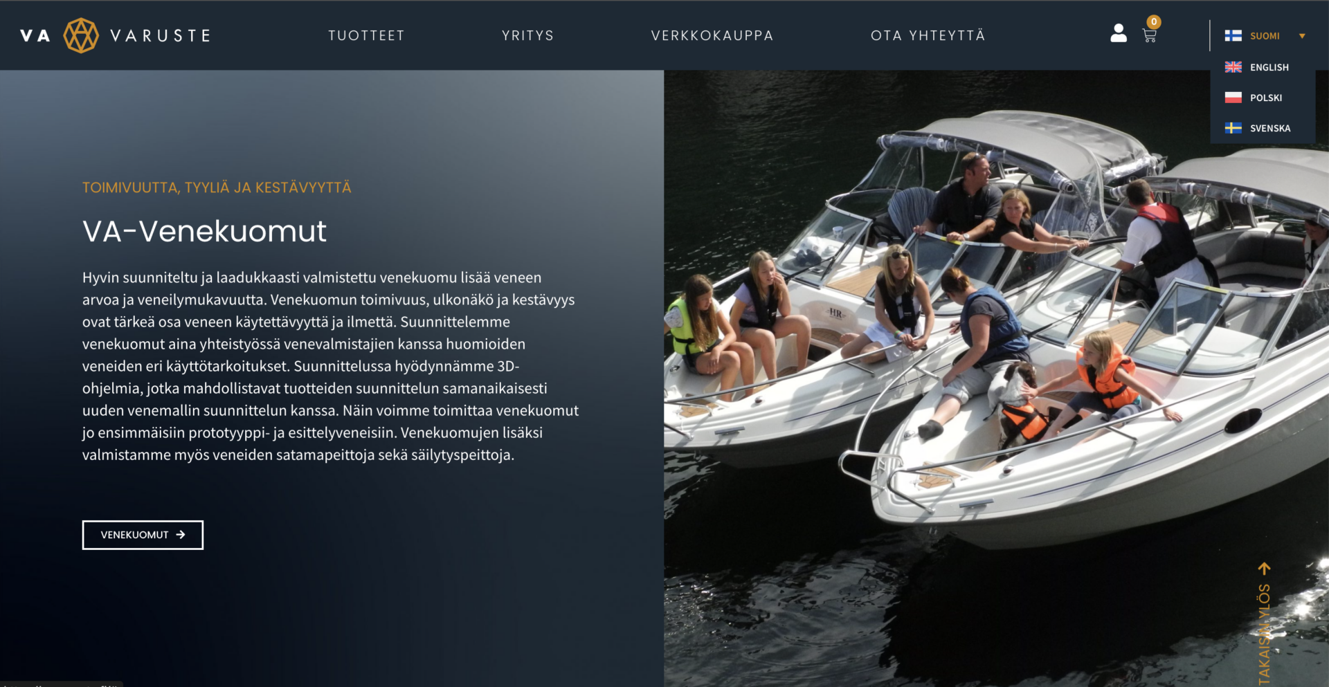 VA-Varuste on palvellut venevalmistajia ja yksityisasiakkaita jo yli 50 vuoden ajan. Asiakkaitamme ovat kaikki merkittävät venevalmistajat niin Suomessa kuin Pohjoismaissakin. Lisäksi tuotteitamme toimitetaan myös Keski- ja Etelä-Eurooppaan. Euroopan suurimpana alkuperäiskuomujen valmistajana yksityisasiakkaamme saavat meiltä aina täsmällisesti omaan venemalliin sopivan alkuperäisten kaavojen – ja mallien mukaan tehdyn laatukuomun.